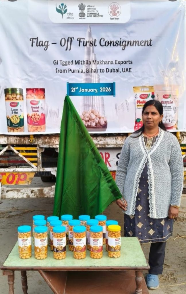 Patna . JP News. The first export consignment of makhana (fox nuts) was sent from Purnea to Dubai on January 21, marking a significant milestone for Bihar’s agricultural export sector. The container was officially flagged off by the Agriculture Department, symbolising the state’s growing presence in the international agri-market.